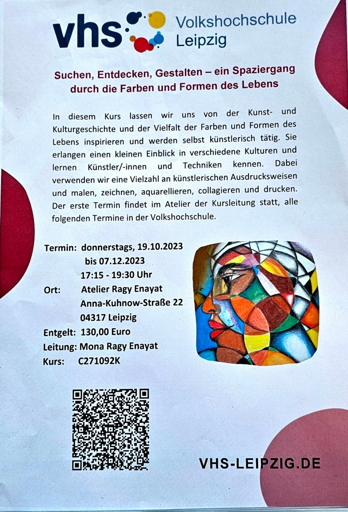 Suchen, Entdecken, Gestalten – Ein Spaziergang durch die Farben und Formen des Lebens. Volkshochschule Leipzig, Kursleiterin: Mona Ragy EnayatVHS-LeipzigVHS-LeipzigVHS LeipzigFührung im Museum der bildenden Künste LeipzigFührung in der Willi-Sitte Galerie MerseburgFührung und Konzert: „Augen auf“, Willi Sitte Galerie Merseburg„Augen auf“,Willi Sitte Galerie MerseburgVorstellung eines Buches, welches ich mit Grundschulkindern gestaltet habe.Schülerlesungen zur Buchmesse Führung – MdbK LeipzigKunstausstellung-GrundschuleLesungen & Literatur-EventsIch wurde als Kulturbotschafterin Ägyptens in einer virtuellen Botschaft in Leipzig ausgewählt„Die schlimmste Form des Schleier ist das Schweigen“ Frauenkultur e.V. LeipzigLesung auf der Buchmesse: Gedok Leipzig, Gohliser SchlösschenPodiumsdiskussion im Museum der Bildenden Künste Leipzig – Marcus Andrew Hurtttig, Julia Blume (HGB,) Mona Ragy Enayat, Michael ToumaMappen-Kurs unter der Leitung von Mona Ragy Enayat, Fachoberschule- Die Mappe fürs Kunststudium